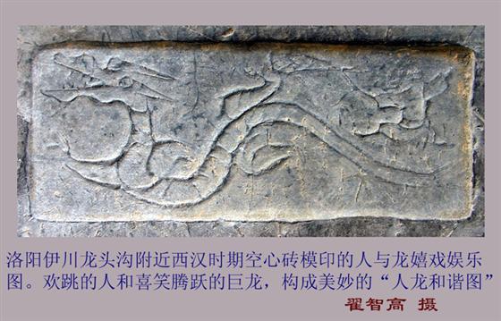 1993年秋,在古都洛阳龙门以南20多公里的伊川县平等乡龙头沟口附近,群众取土时发现西汉时期的空心砖,砖上模印有精美的图案和人物画面,尤为引人注意的是模印有“捕龙图”图案,龙巨口,双目双角,飞腾跳跃,龙后尾上部有一小人作撒网状,欲捕龙。据查询,该捕龙图在全国出土文物中是罕见的孤品,该文物出土于龙头沟,是否该沟有“龙”呢?