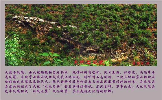 天然石龙正南有凤凰沟,沟壁有天然石凤凰,与天然石龙一道形成龙凤呈祥的自然奇观:石凤凰凤嘴似衔有宝珠,凤目美丽,双眼皮,头顶有石质凤冠,自然弯曲的石线组成凤头上的羽毛,腭下有石质凤胡,一波三折的岩石褶皱层恰好构成凤凰长长的尾巴。绿色的野生酸枣树成为天然石凤凰最巧妙的衬景,与天然石龙一道形成龙凤呈祥的自然奇观。